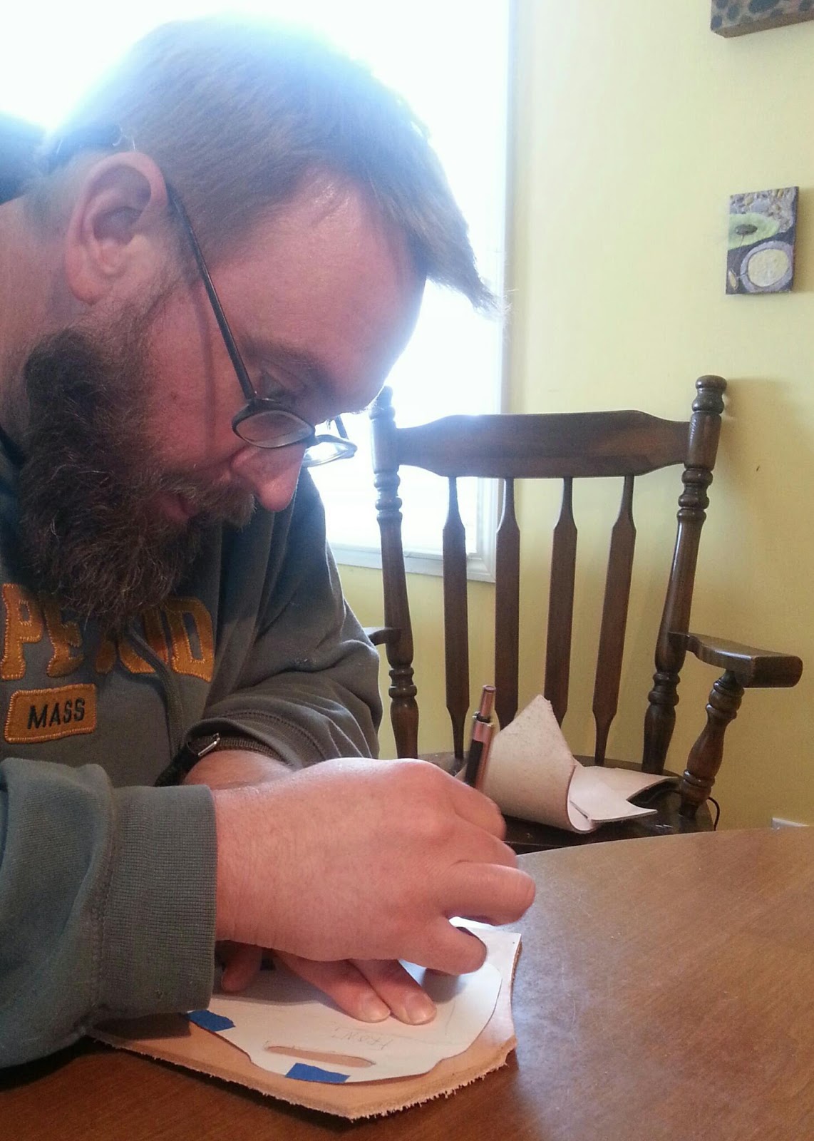 Once he had the paper version the way he like it, he traced the paper cut out onto a piece of cow leather.